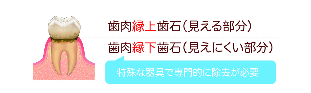 歯石は付着する場所によって、歯茎より上の「歯肉縁上(えんじょう)歯石」と「歯肉縁下(えんか)歯石」の2種類に分類されます。特に、歯と歯ぐきの中にできる「歯肉縁下歯石」は目視することが難しく、非常に硬く、歯に強固に付着しているため、専門知識を備えた歯科医師や歯科衛生士による処置が必要です。